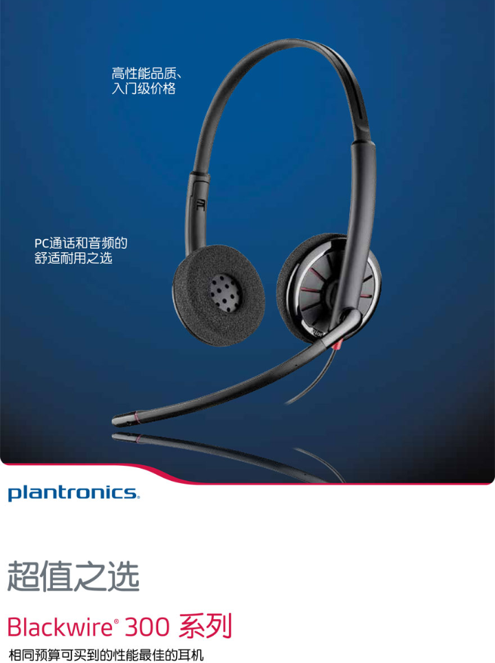 超值之选-相同预算可买到的性能最佳的耳机。高性能品质、入门级价格助您顺利进入UC时代。 Blackwire 300 系列耳机操作简单、舒适耐用,适用于电话会议、网络培训和电脑多媒体应用程序。另外,Blackwire 300 系列价格合适、易于部署,让IT人员可以轻松全面地推广及升级 UC 解决方案。