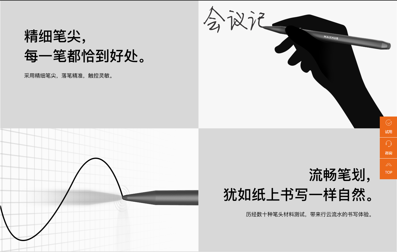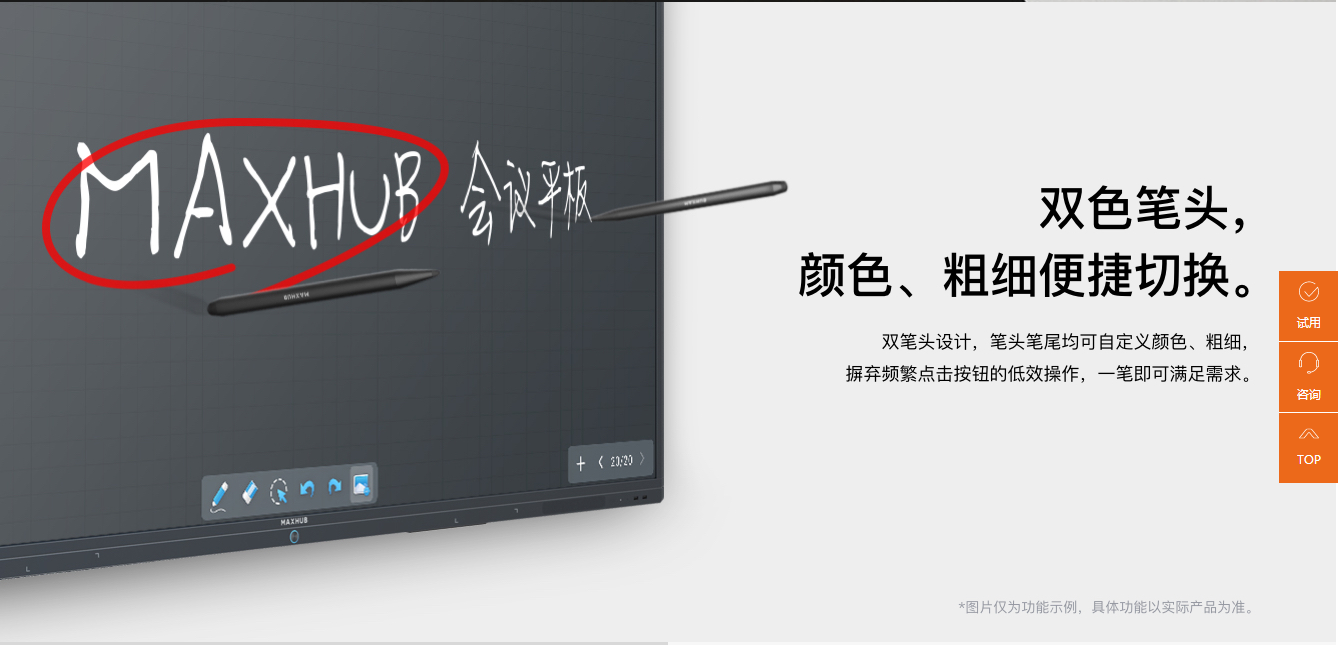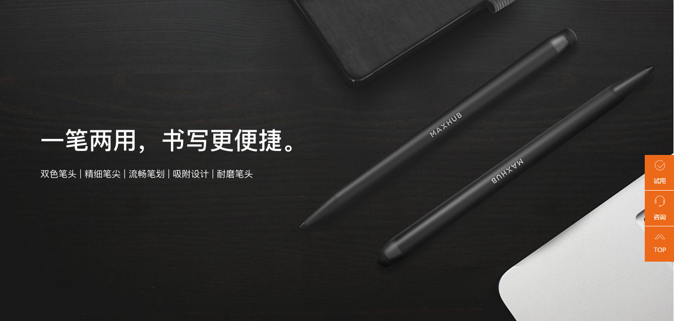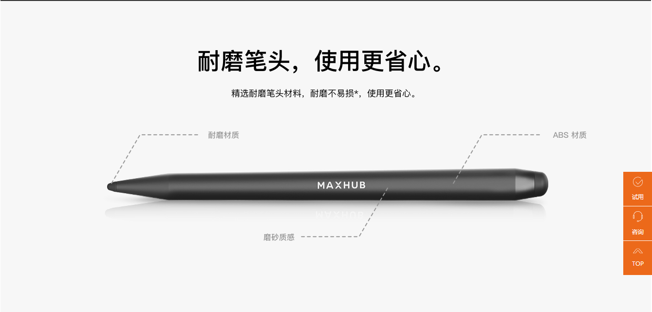双色触控笔在负重 500g 的情况下,连续直线书写 5公里,笔头损耗不大于 1mm,数据来源于 MAXHUB 实验室。